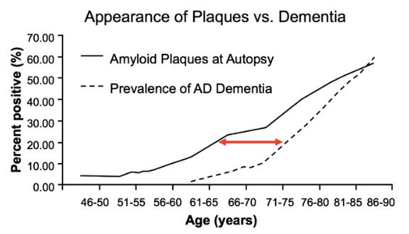 (圖2) 大腦類澱粉蛋白累積(Amyloid plaques)和阿茲海默失智症(AD dementia)的發生之間,大約有10年的延遲,取決於發病年齡。Alzheimer’s & Dementia 7 (2011) 280-92