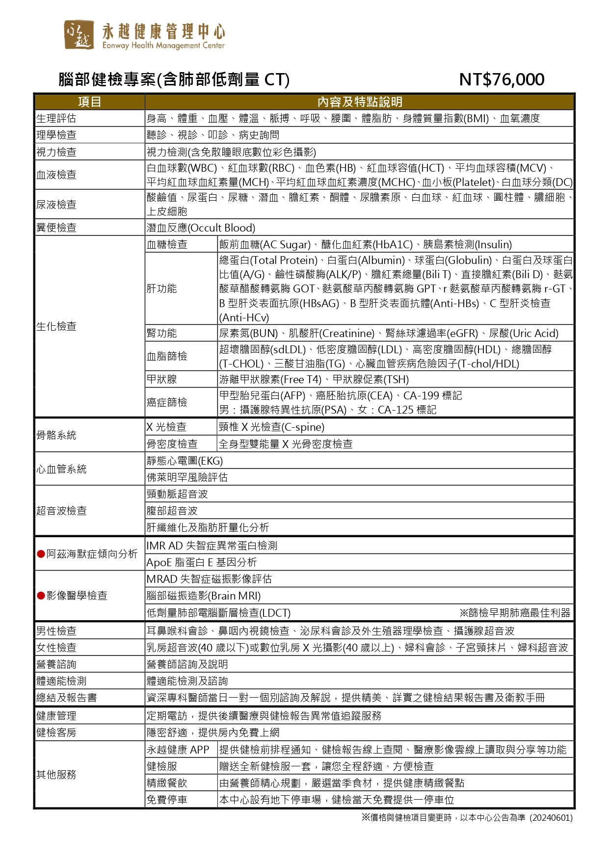 以腦中風、腦瘤、早期失智風險評估為主軸,包括:腦部MRI檢查、阿茲海默症傾向及抽血檢驗生物標記檢測分析,檢測腦中異常蛋白濤 (tau)與類澱粉 (Aß)、ApoE脂蛋白E基因分析,及腦部是否有腫瘤、血管阻塞、血管瘤、血管畸形、大腦皮質發育異常、腦中風,搭配血液生化檢查、超音波(頸動脈+腹部)及男女性特殊項目等檢查,抓出可疑病灶,超前預防,降低可能的疾病風險。